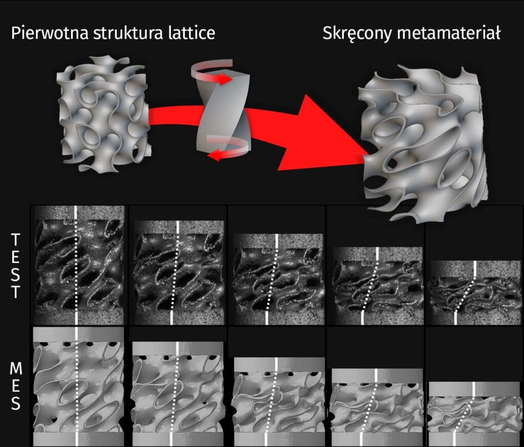 Metamateriały budowane są w oparciu o innowacje strukturalne, pozwalające na otrzymanie niewystępujących naturalnie właściwości mechanicznych i nietypowych funkcjonalności. W tym przypadku mamy do czynienia ze strukturą zachowującą się jak ośrodek mikropolarny, przenoszący zarówno naprężenia siłowe, jak i momentowe, którego punkty mają sześć stopni swobody. Dzięki wykorzystaniu specjalnych struktur o gyroidalnej budowie komórkowej, prezentowane metamateriały reagują na obciążenie nieliniowo, wykazując moment skręcający. W ten sposób liniowa siła obciążenia przekształcona zostaje w deformację skrętną.