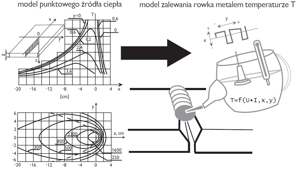 Kontrola procesów cieplnych spawania opiera się na rozwiązywaniu równań różniczkowych wymiany ciepła podczas spawania. W latach 70-tych pojawiły się prace opisujące procesy rozchodzenia się ciepła poprzez rozwiązywanie równań wymiany ciepła. Ponieważ w przypadku topienia metalu problem jest dosyć trudny, gdyż rozwiązania takich równań różniczkowych udaje się uzyskać stosunkowo prosto dla funkcji liniowych, pominięto bardzo istotny element – nieliniowe wprowadzenie ciepła topienia. Dla dociekliwego fizyka byłoby to niedopuszczalne, lecz względy praktyczne i możliwość wyliczania szybkości chłodzenia i przewidywania hartowania się strefy wpływu ciepła zwyciężyły. O dziwo, matematycy wykonujący obliczenia cyfrowe metodą elementów skończonych, zamiast próbować zbliżyć się do rzeczywistości, próbowali dopasować funkcję „od tyłu”, wstawiając wirtualny rozkład temperatury łuku. Było to możliwe dlatego, że w latach 80-tych tylko przyszły rektor UJ, prof. Musioł, dysponował stanowiskiem do badania rozkładu temperatury łuku. Przy istniejących wtedy komputerach „Odra”, pomiary fotopowielaczem trwały kilka godzin, a obliczenia – kilka tygodni.