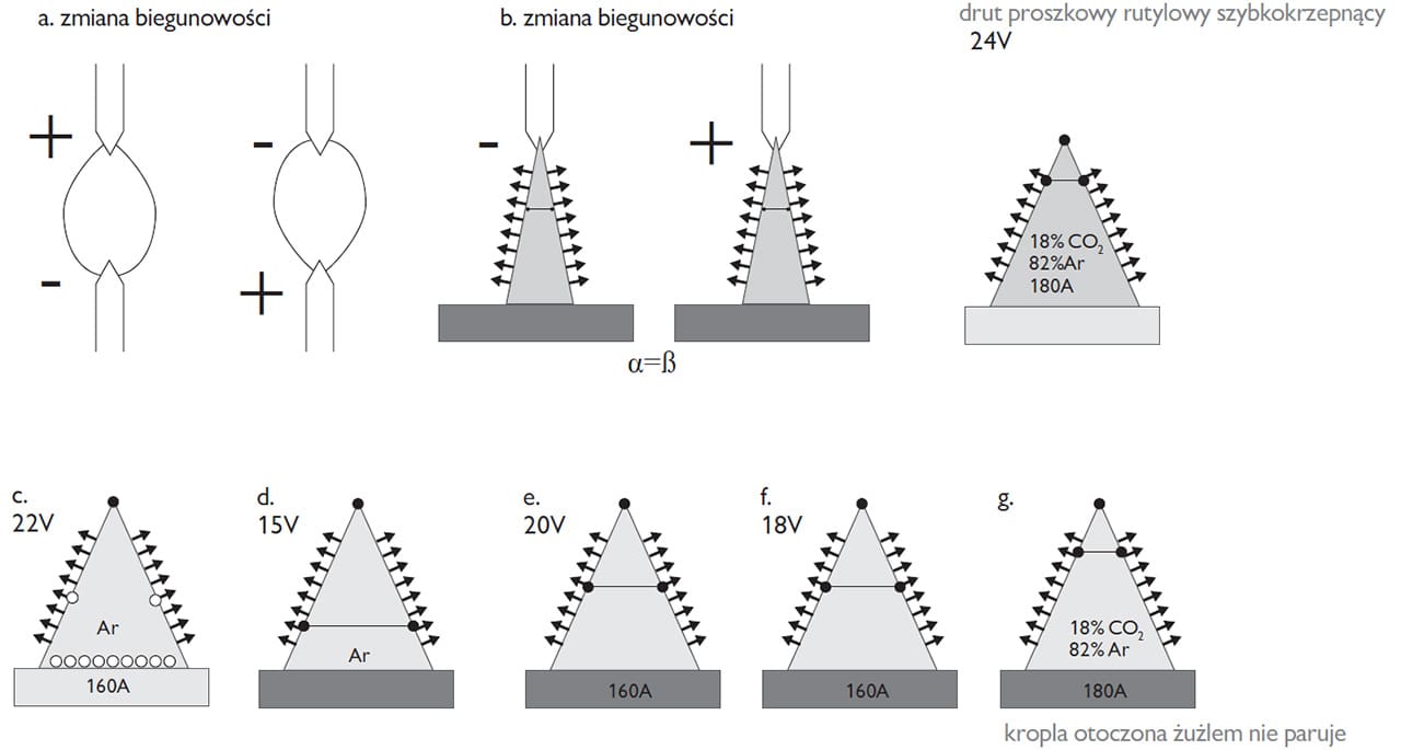 Dodanie oparów składników stali nierdzewnej czy dużych cząstek pochodzących z drutu proszkowego lub O2 lub CO2 zwiększa prawdopodobieństwo zderzenia i rozszerza łuk. Przechodzenie kropli otoczonej żużlem podczas spawania drutem proszkowym (Rys. 5g) uniemożliwia parowanie kropli stali nierdzewnej i nie zmienia parametrów spawania, które zazwyczaj wynoszą 180A i 24V (mieszanka 18% CO2 i 82% Ar).