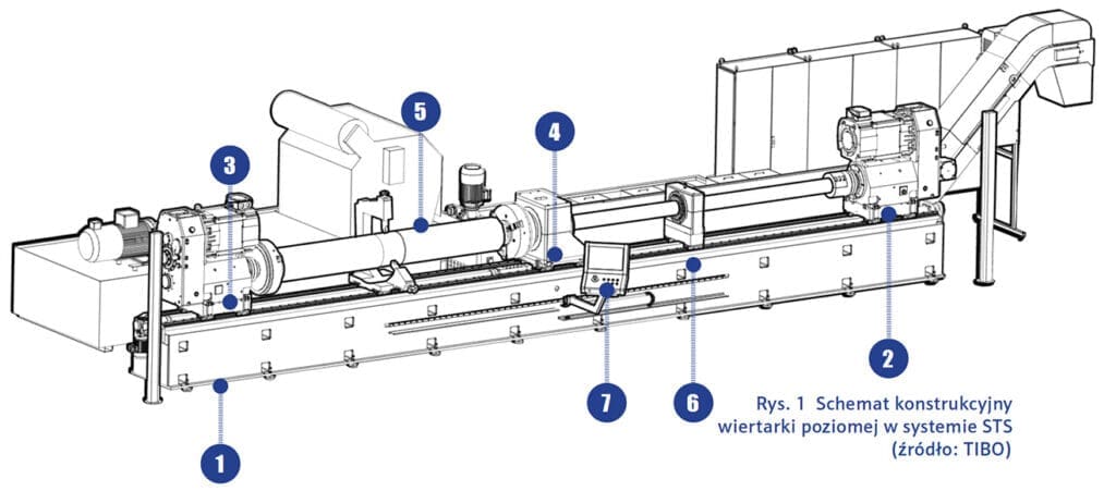 W systemie STS wiertarka pozioma składa się z kilku podstawowych elementów (Rys. 1). Podobnie jak dla pozostałych typów obrabiarek, łoże (1) jest bazowym elementem konstrukcyjnym wiążącym pozostałe komponenty, a technologia jego wykonania oraz zastosowane materiały mają za zadanie jak najlepsze tłumienie drgań, dając odpowiednie warunki wyjściowe dla całego procesu. Należy zwrócić uwagę na fakt, że ze względu na długość obrabianych przedmiotów konieczne jest stosowanie podziału łoża na segmenty, w celu umożliwienia transportu do miejsca docelowego wdrożenia obrabiarki.